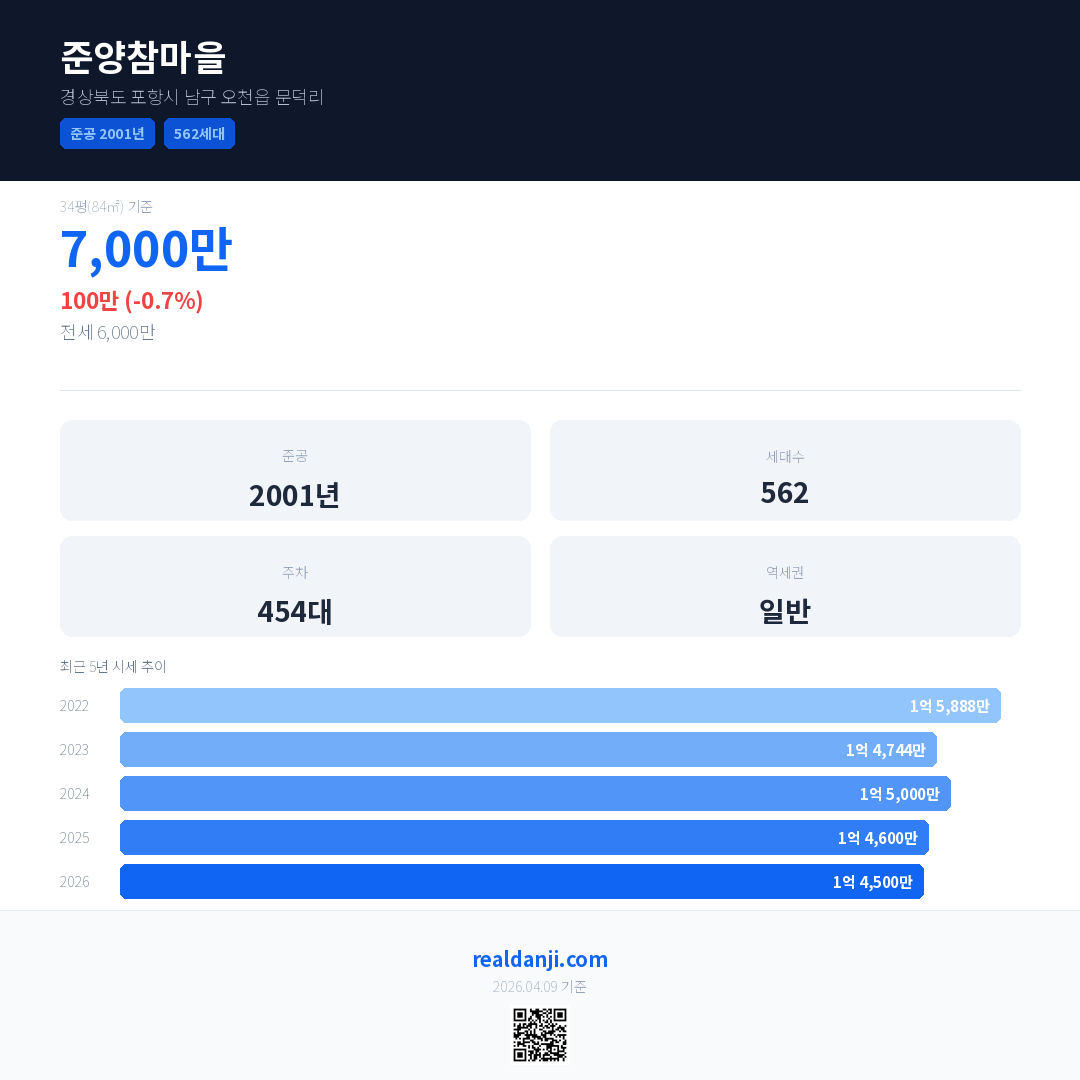 준양참마을 국민평형 기준 2026년 평균 거래가는 1억 4,500만으로, 전년 대비 0.7% 하락 했습니다.