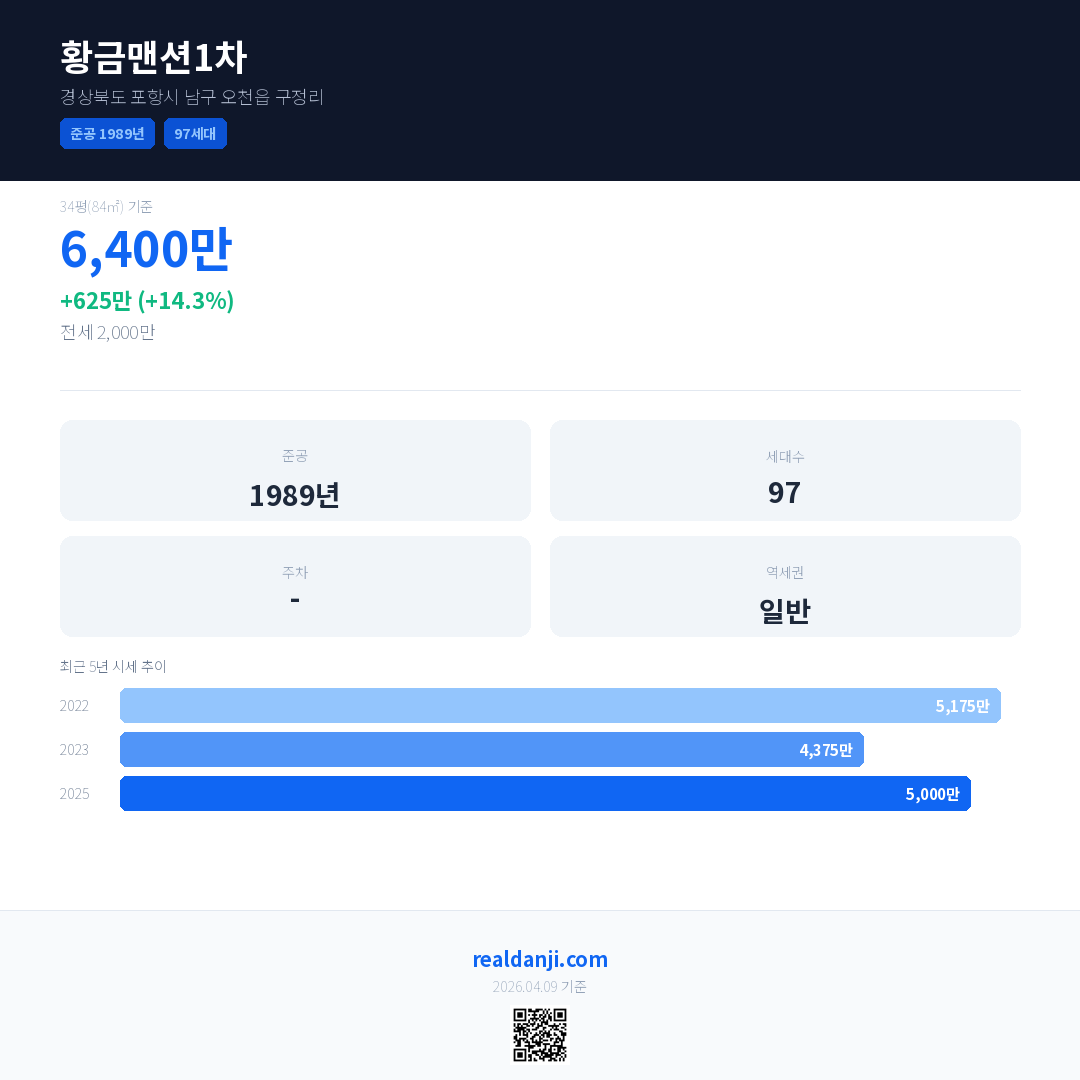 황금맨션1차 국민평형 기준 2025년 평균 거래가는 5,000만으로, 전년 대비 14.3% 상승 했습니다.