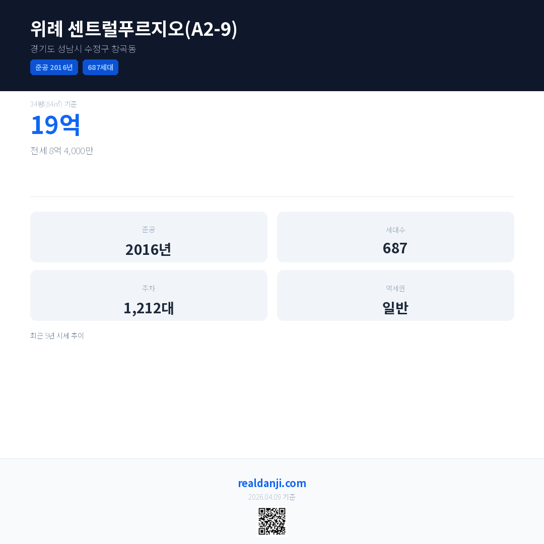 위례 센트럴푸르지오(A2-9) 최근 거래가는 19억입니다. (2026-02)