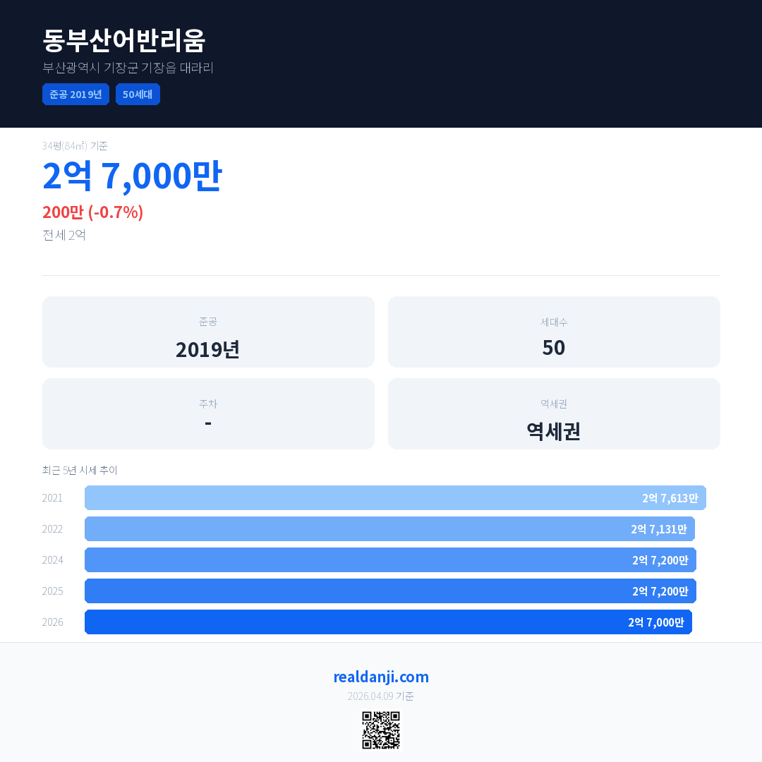 동부산어반리움 국민평형 기준 2026년 평균 거래가는 2억 7,000만으로, 전년 대비 0.7% 하락 했습니다.