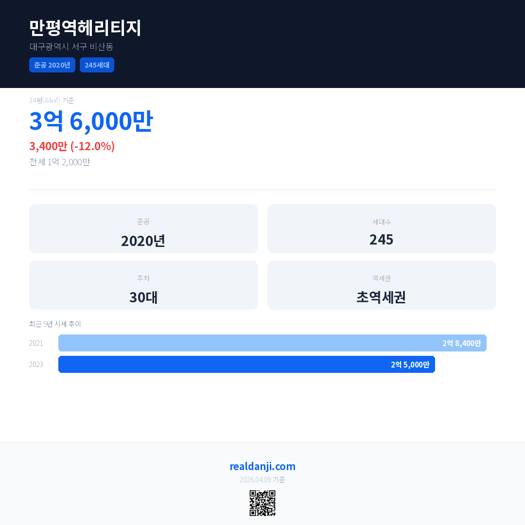 만평역헤리티지 국민평형 기준 2023년 평균 거래가는 2억 5,000만으로, 전년 대비 12.0% 하락 했습니다.
