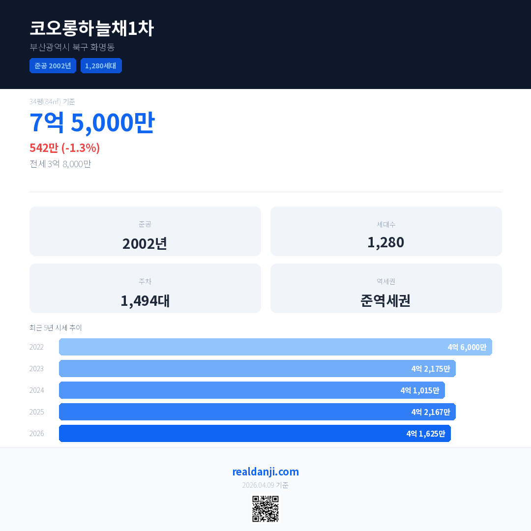 코오롱하늘채1차 국민평형 기준 2026년 평균 거래가는 4억 1,625만으로, 전년 대비 1.3% 하락 했습니다.