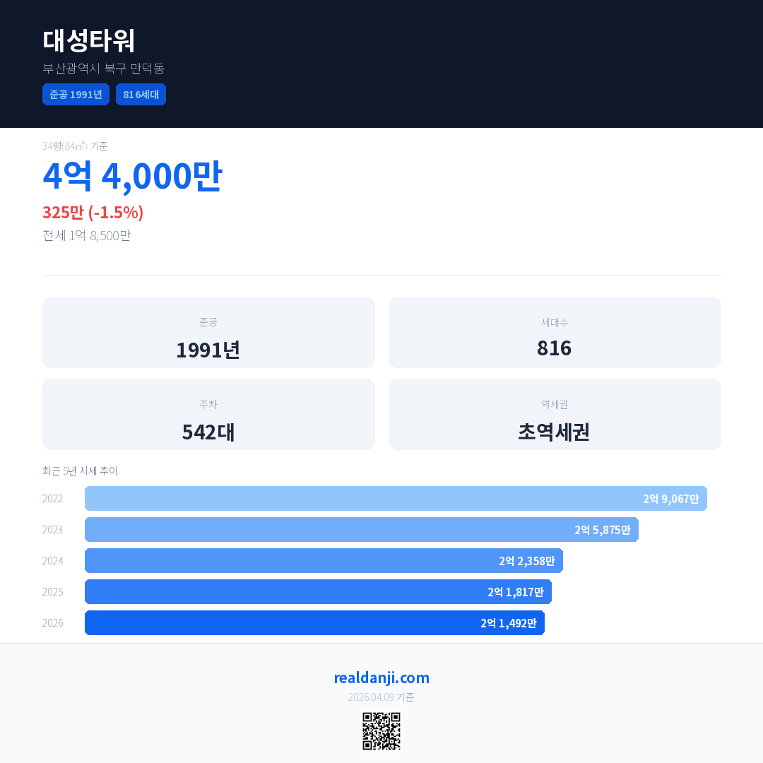 대성타워 국민평형 기준 2026년 평균 거래가는 2억 1,492만으로, 전년 대비 1.5% 하락 했습니다.