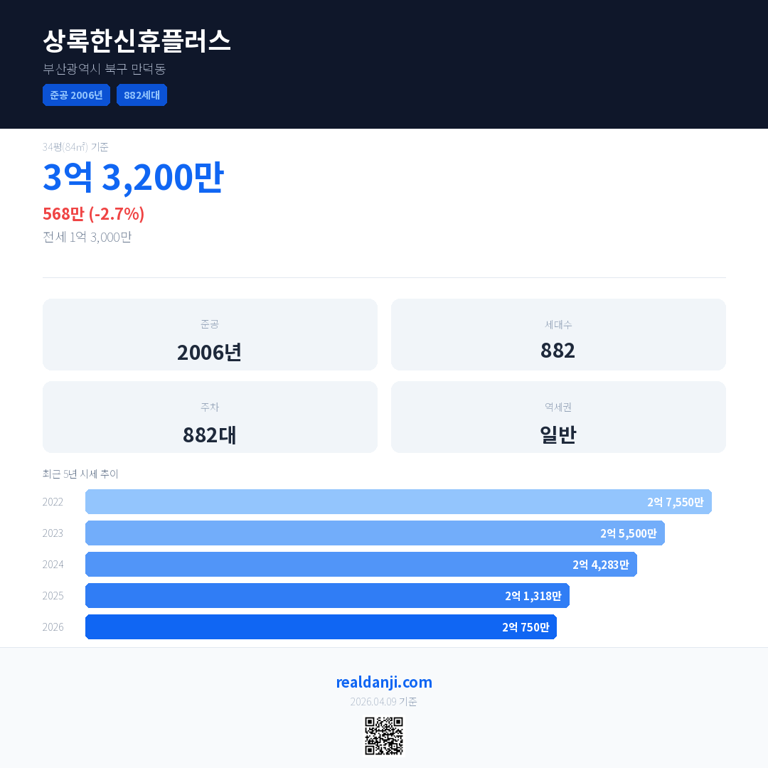 상록한신휴플러스 국민평형 기준 2026년 평균 거래가는 2억 750만으로, 전년 대비 2.7% 하락 했습니다.