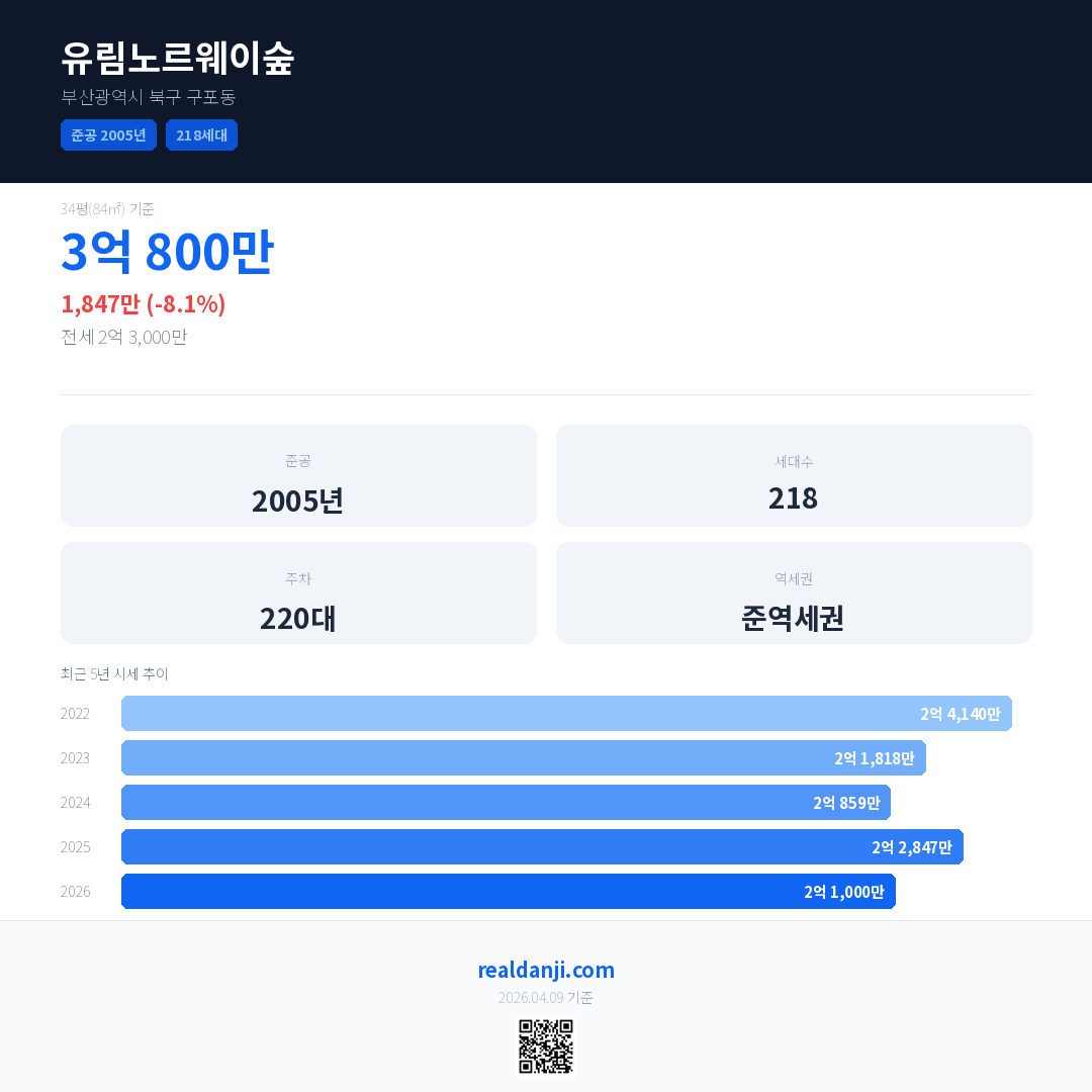 유림노르웨이숲 국민평형 기준 2026년 평균 거래가는 2억 1,000만으로, 전년 대비 8.1% 하락 했습니다.