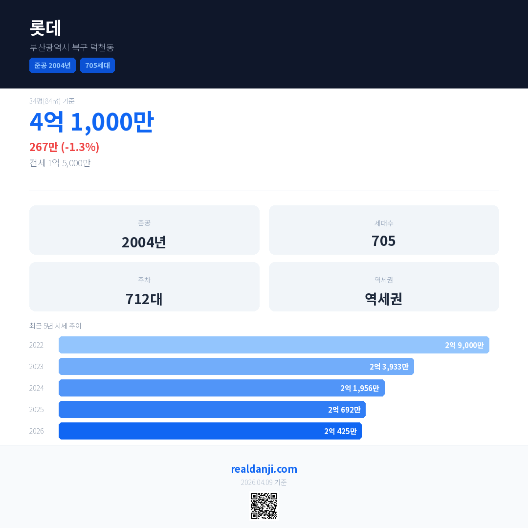 롯데 국민평형 기준 2026년 평균 거래가는 2억 425만으로, 전년 대비 1.3% 하락 했습니다.