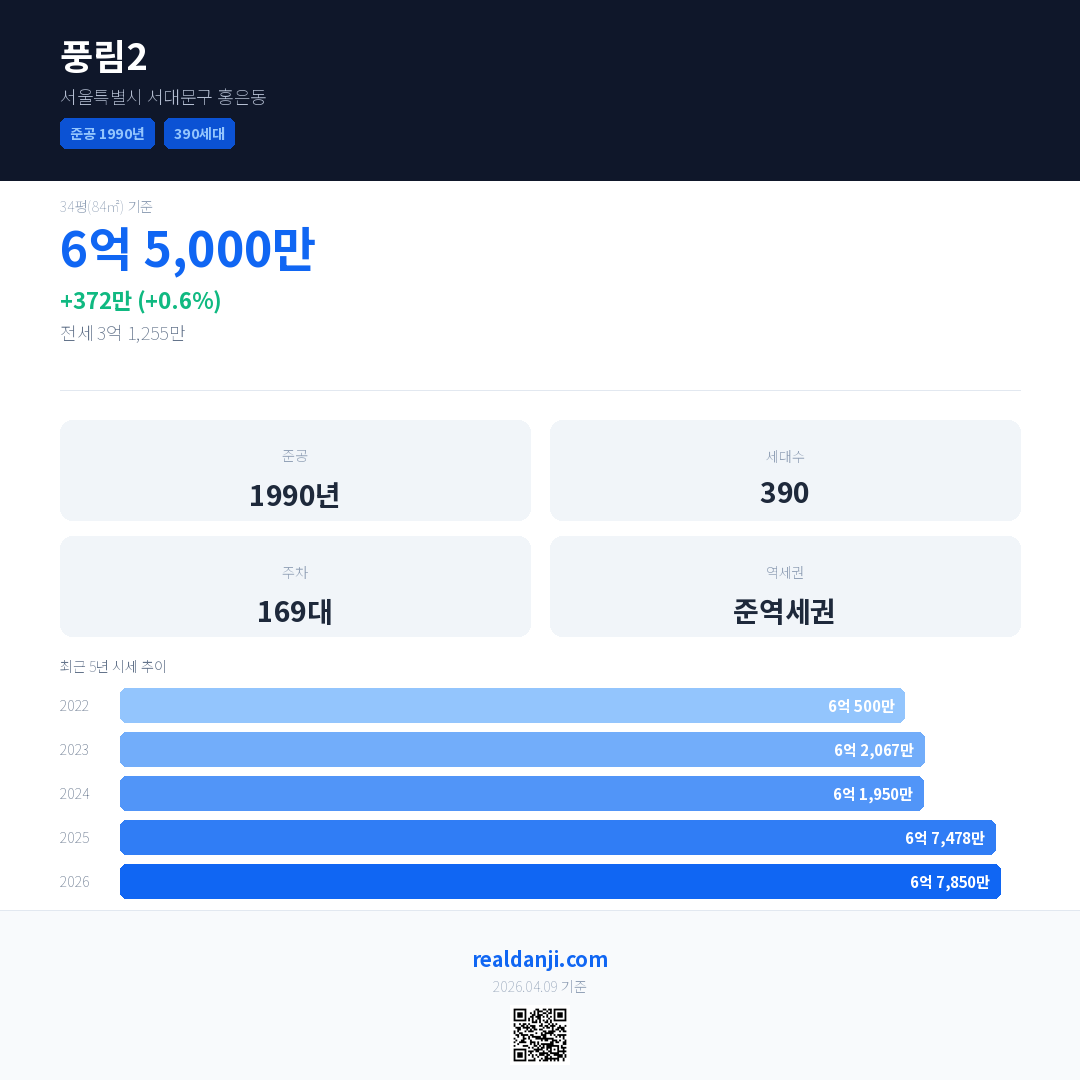 풍림2 국민평형 기준 2026년 평균 거래가는 6억 7,850만으로, 전년 대비 0.6% 상승 했습니다.