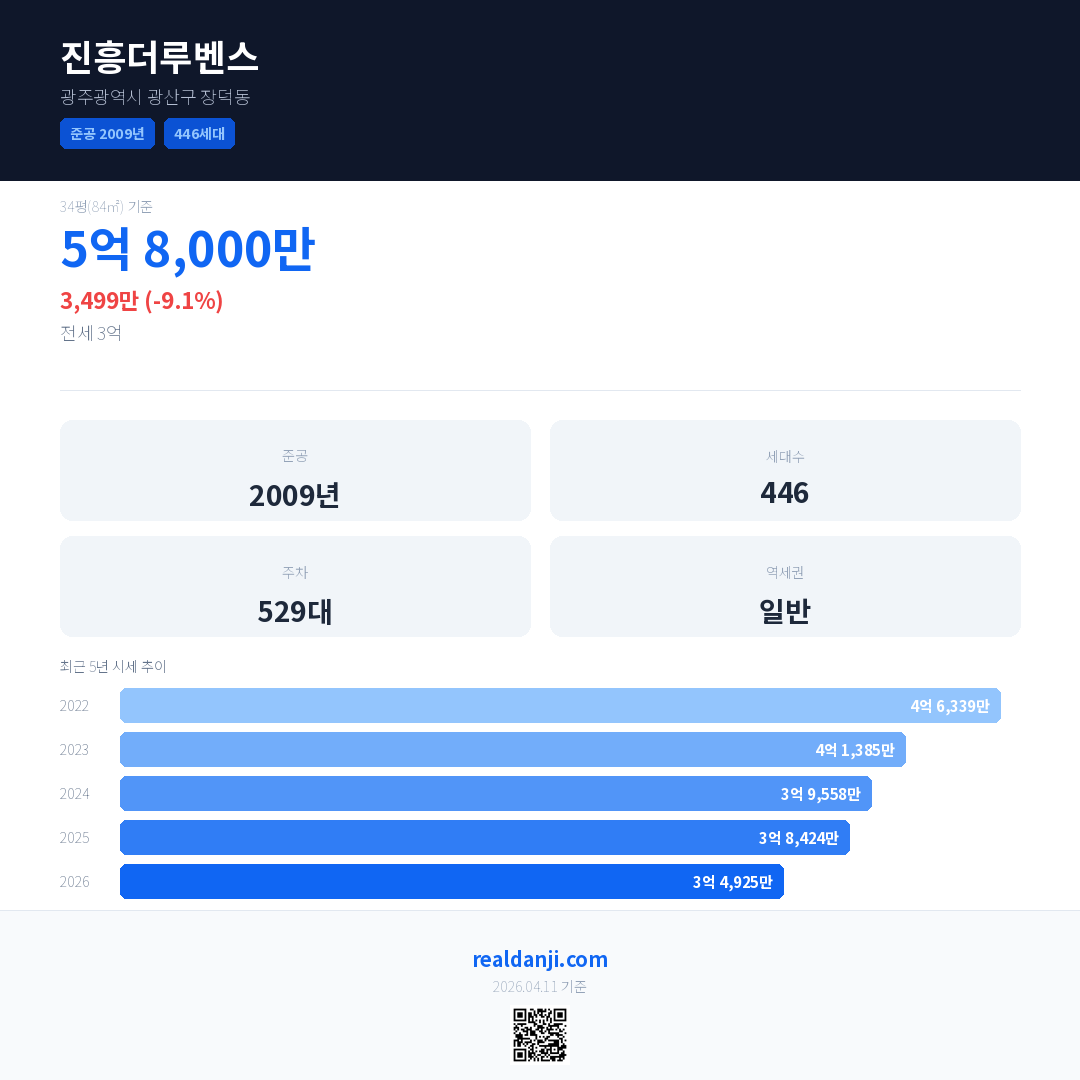 진흥더루벤스 국민평형 기준 2026년 평균 거래가는 3억 4,925만으로, 전년 대비 9.1% 하락 했습니다.