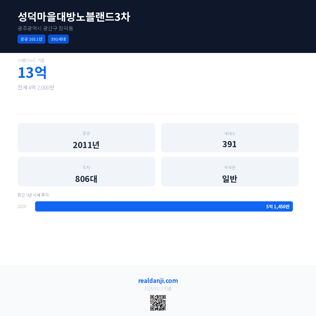 성덕마을대방노블랜드3차 최근 거래가는 13억입니다. (2026-03)