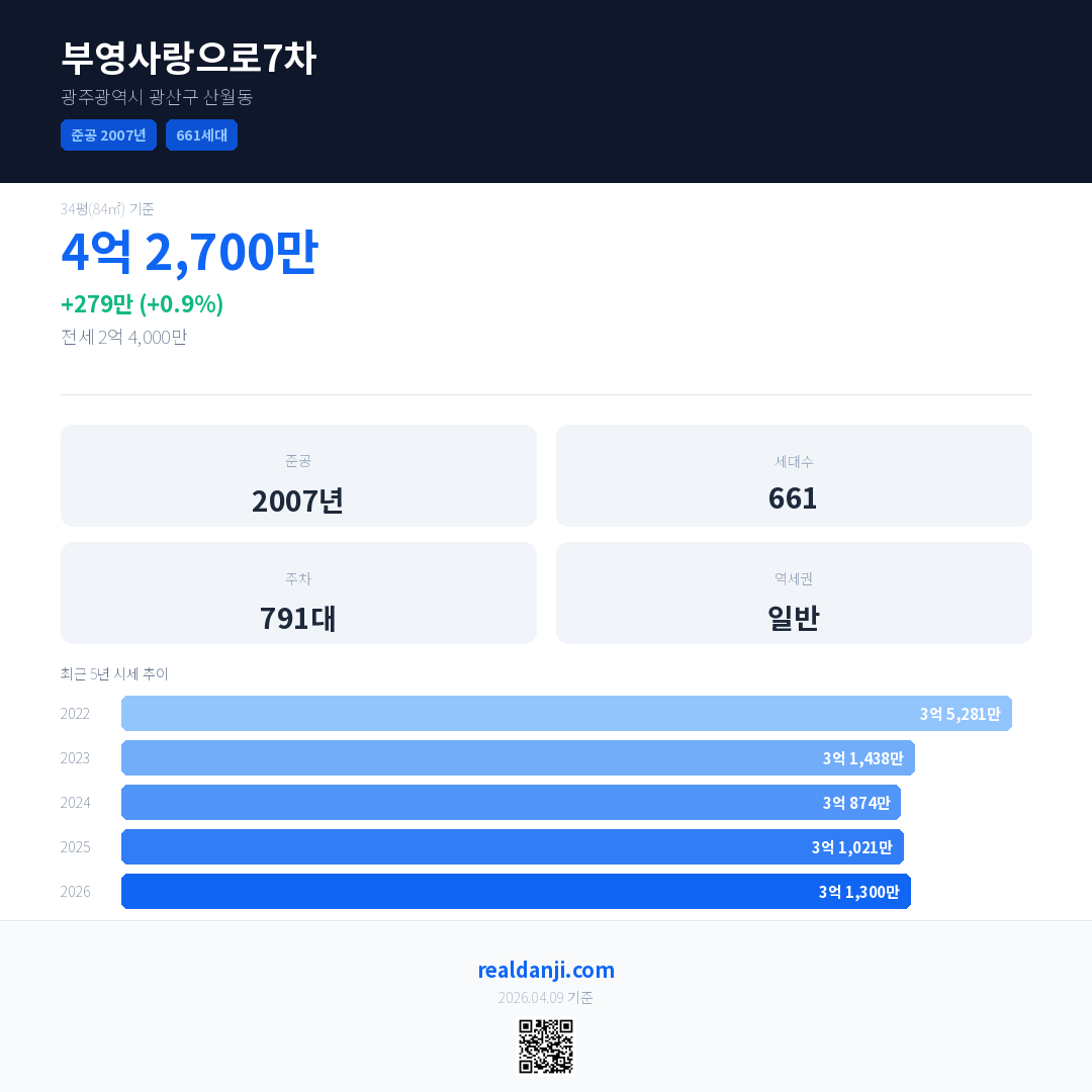 부영사랑으로7차 최근 거래가는 4억 2,700만입니다. (2026-03)