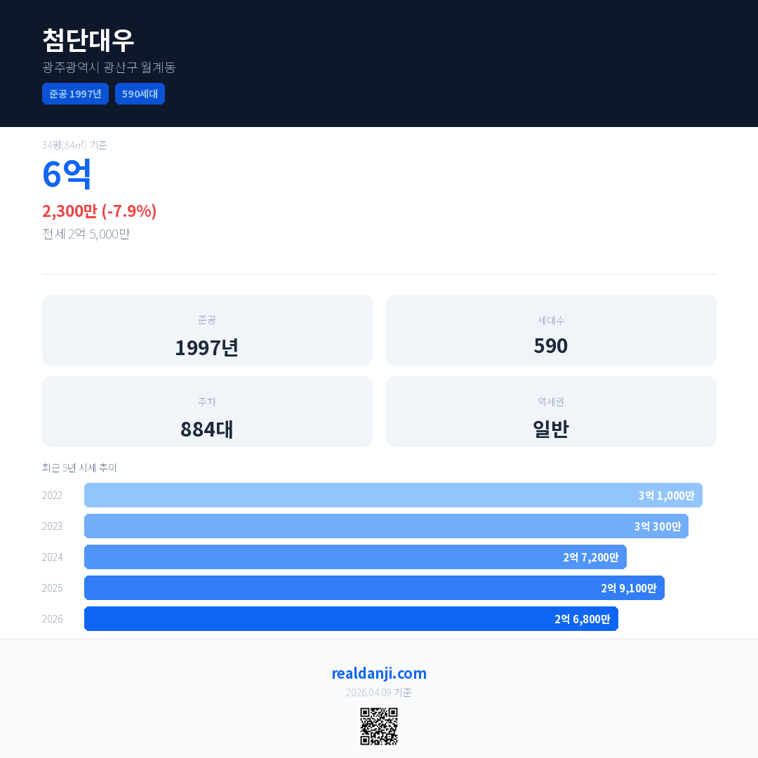 첨단대우 국민평형 기준 2026년 평균 거래가는 2억 6,800만으로, 전년 대비 7.9% 하락 했습니다.