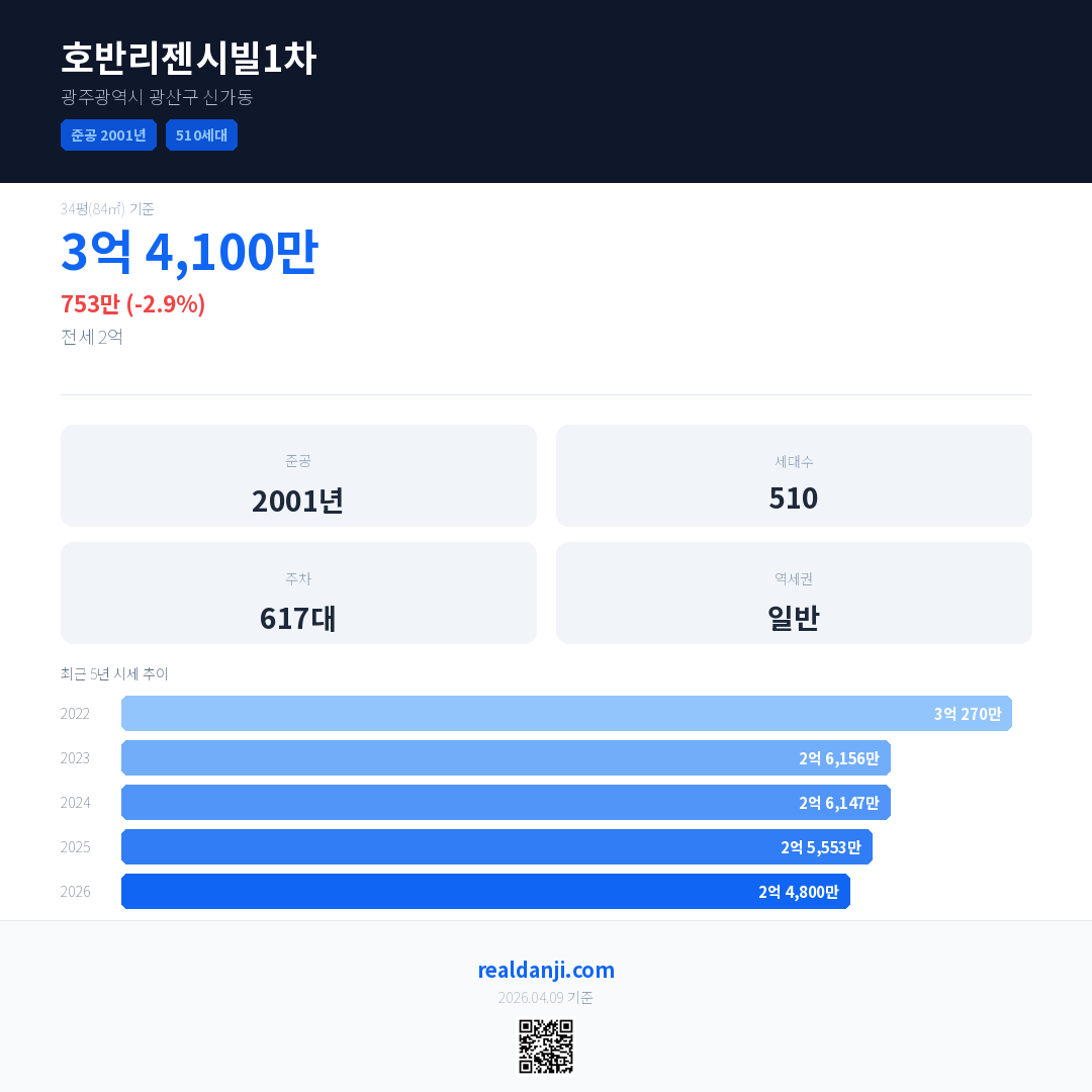 호반리젠시빌1차은(는) 2001년에 준공되었으며, 현재 25년차입니다. 총 510세대 규모입니다.