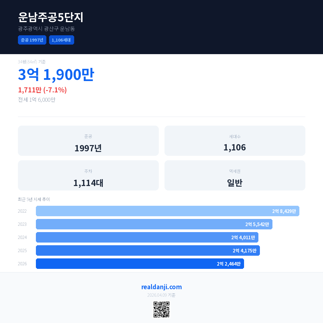 운남주공5단지은(는) 1997년에 준공되었으며, 현재 29년차입니다. 총 1,106세대 규모입니다.