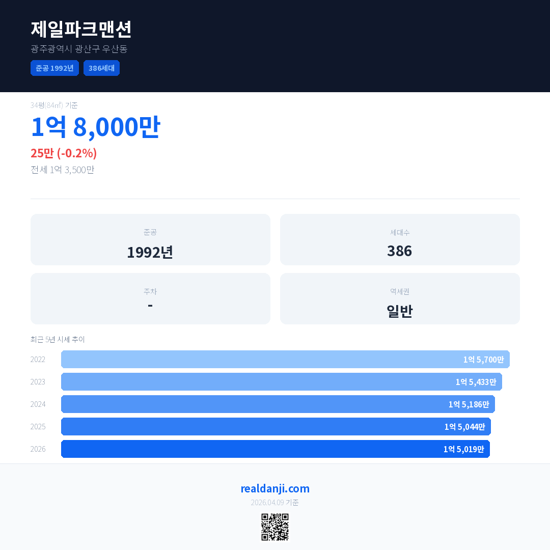 제일파크맨션 국민평형 기준 2026년 평균 거래가는 1억 5,019만으로, 전년 대비 0.2% 하락 했습니다.