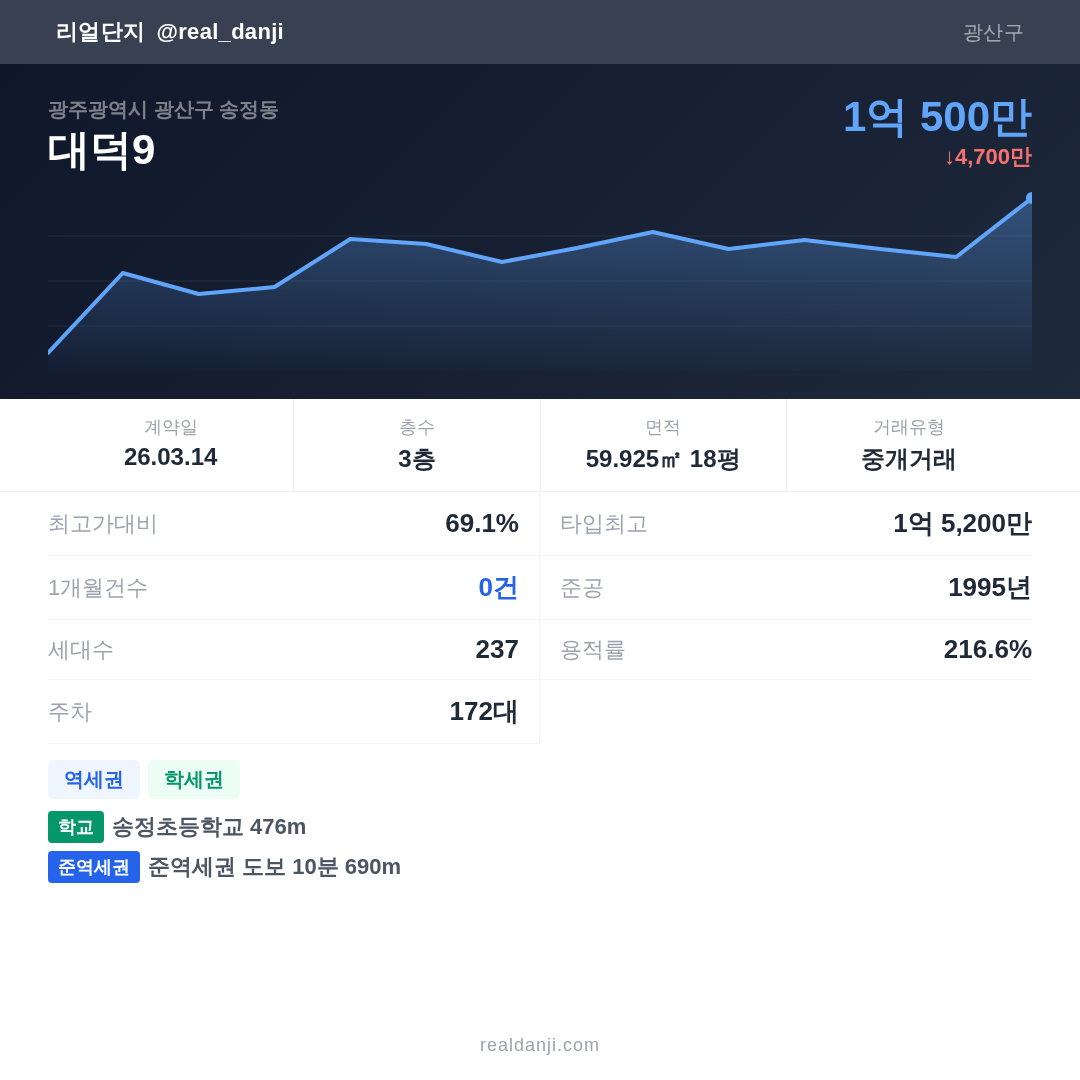 대덕9 최근 거래가는 1억 5,200만입니다. (2026-03)