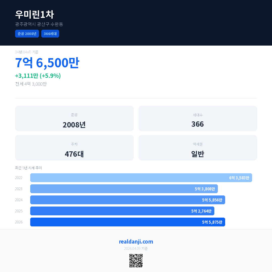 우미린1차 국민평형 기준 2026년 평균 거래가는 5억 5,875만으로, 전년 대비 5.9% 상승 했습니다.