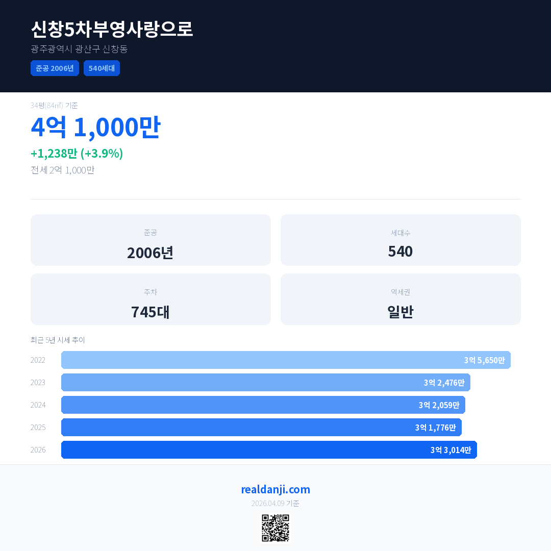 신창5차부영사랑으로 국민평형 기준 2026년 평균 거래가는 3억 3,014만으로, 전년 대비 3.9% 상승 했습니다.