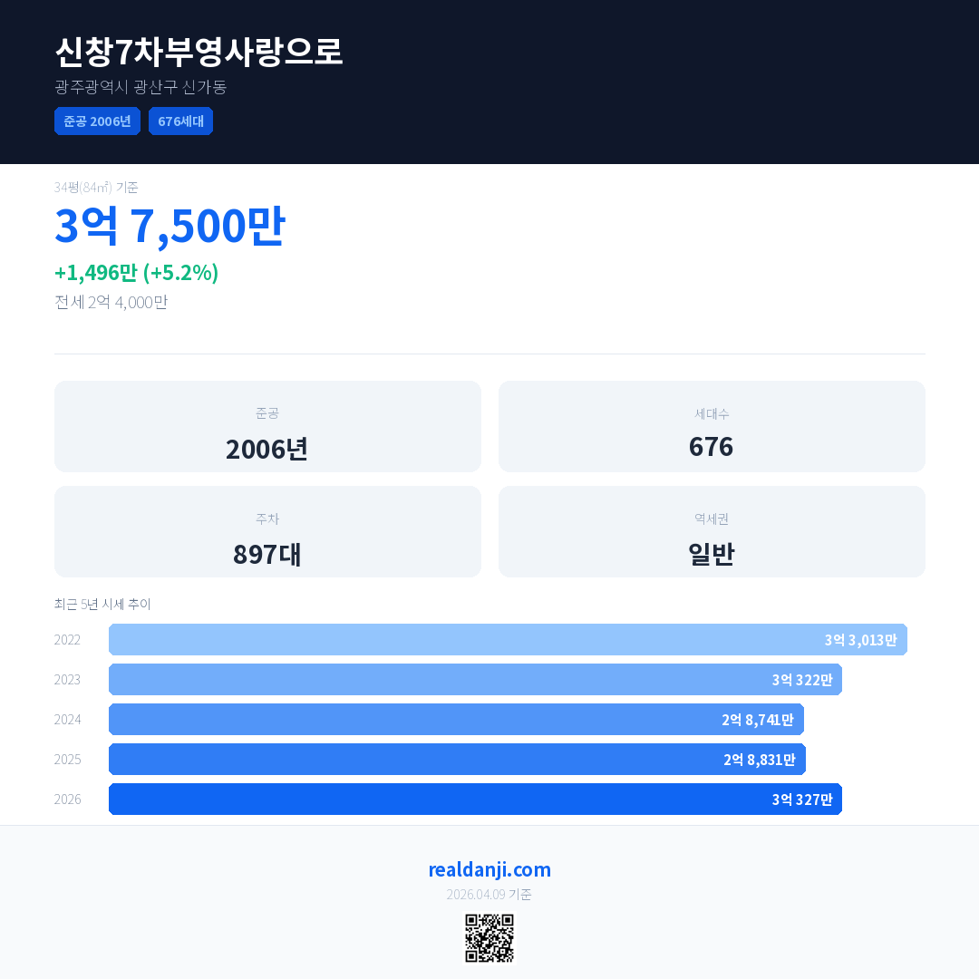 신창7차부영사랑으로 국민평형 기준 2026년 평균 거래가는 3억 327만으로, 전년 대비 5.2% 상승 했습니다.