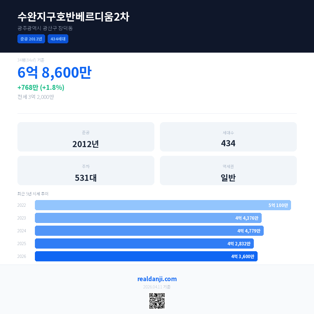 수완지구호반베르디움2차 국민평형 기준 2026년 평균 거래가는 4억 3,600만으로, 전년 대비 1.8% 상승 했습니다.