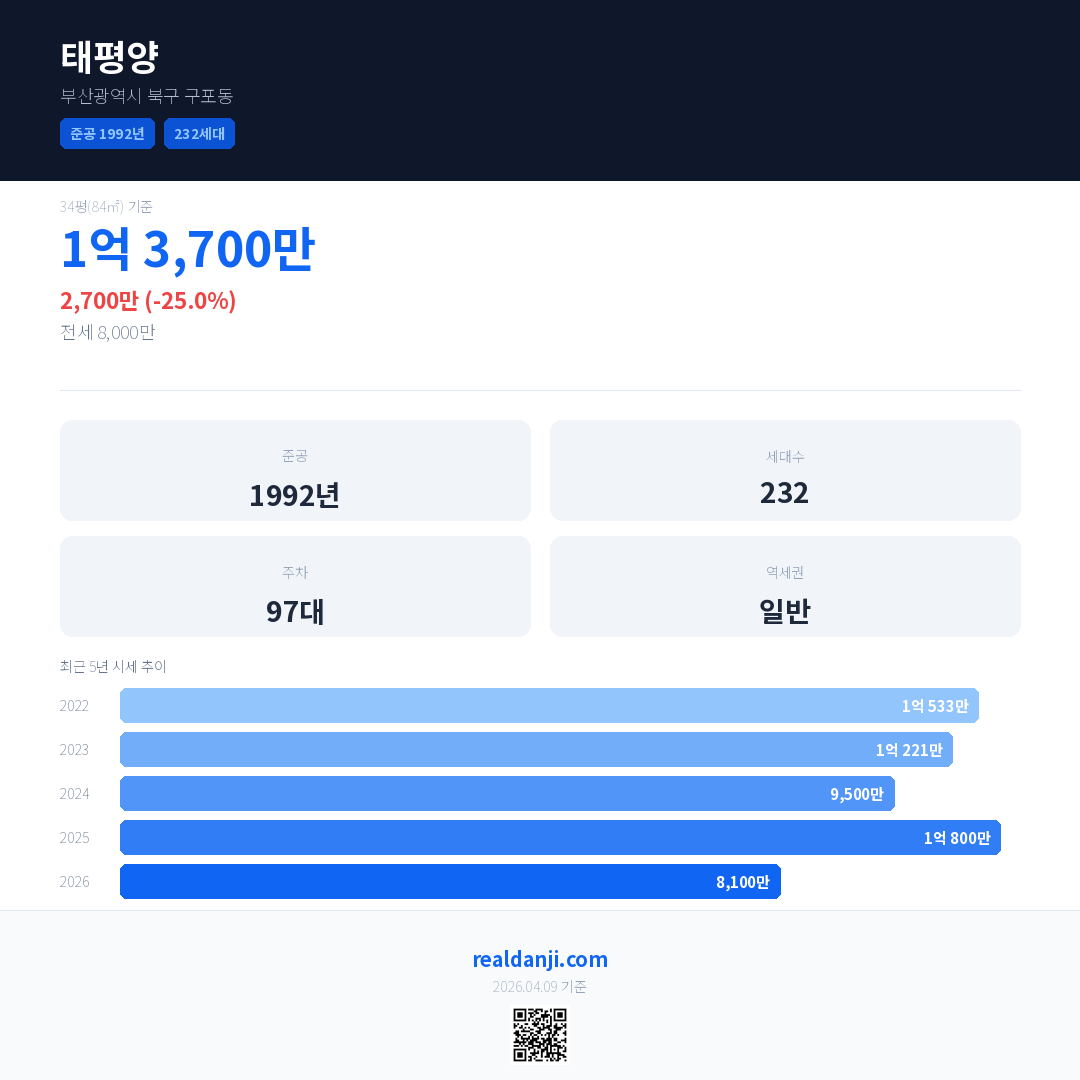 태평양 국민평형 기준 2026년 평균 거래가는 8,100만으로, 전년 대비 25.0% 하락 했습니다.