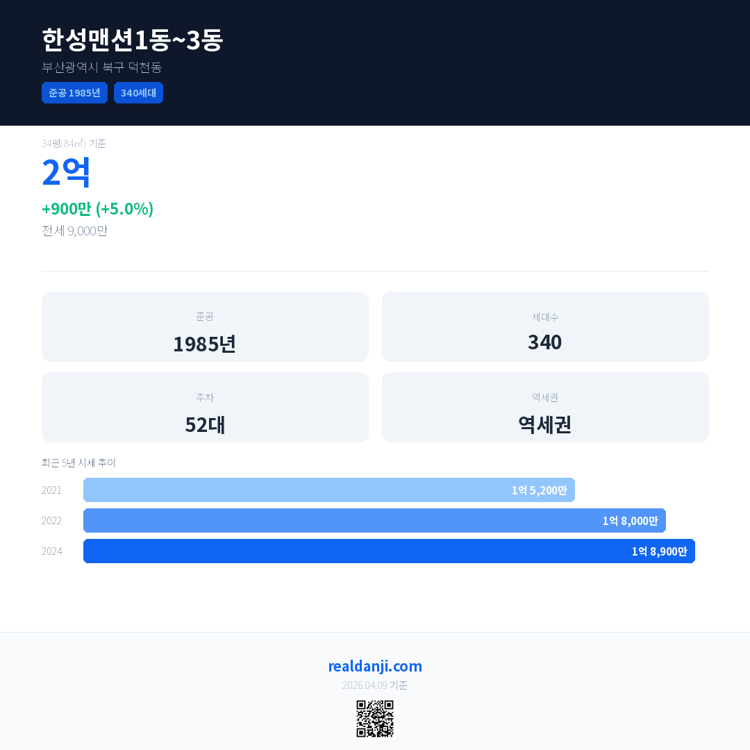 한성맨션1동~3동 국민평형 기준 2024년 평균 거래가는 1억 8,900만으로, 전년 대비 5.0% 상승 했습니다.