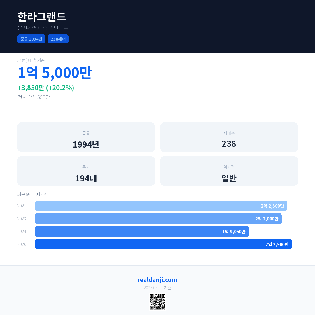 한라그랜드 국민평형 기준 2026년 평균 거래가는 2억 2,900만으로, 전년 대비 20.2% 상승 했습니다.