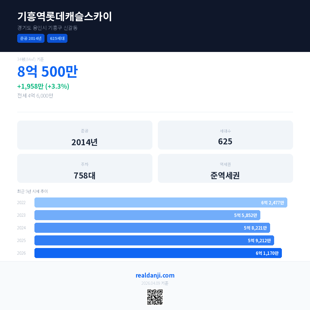 기흥역롯데캐슬스카이 최근 거래가는 8억 500만입니다. (2026-04)