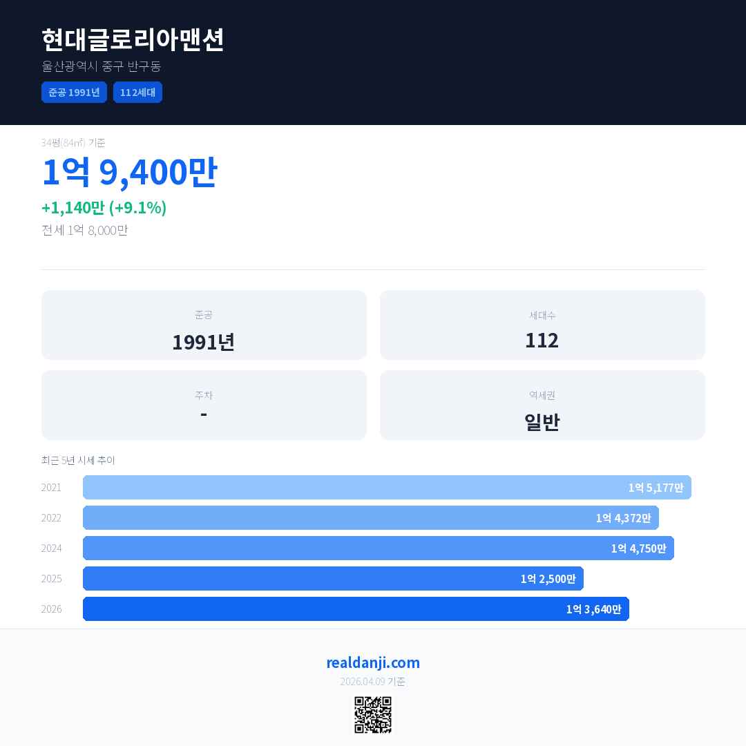 현대글로리아맨션 최근 거래가는 1억 9,400만입니다. (2026-03)