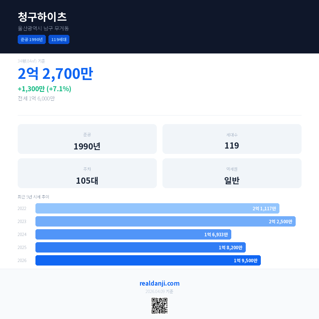 청구하이츠 국민평형 기준 2026년 평균 거래가는 1억 9,500만으로, 전년 대비 7.1% 상승 했습니다.
