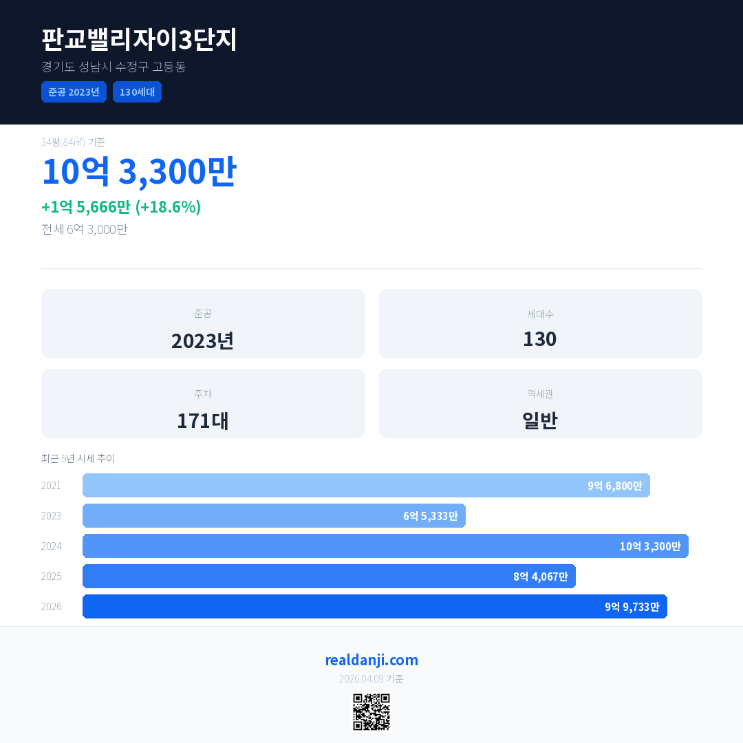 판교밸리자이3단지 최근 거래가는 10억 3,300만입니다. (2026-03)