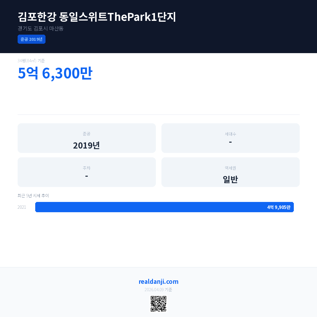 김포한강 동일스위트ThePark1단지 최근 거래가는 5억 6,300만입니다. (2021-06)