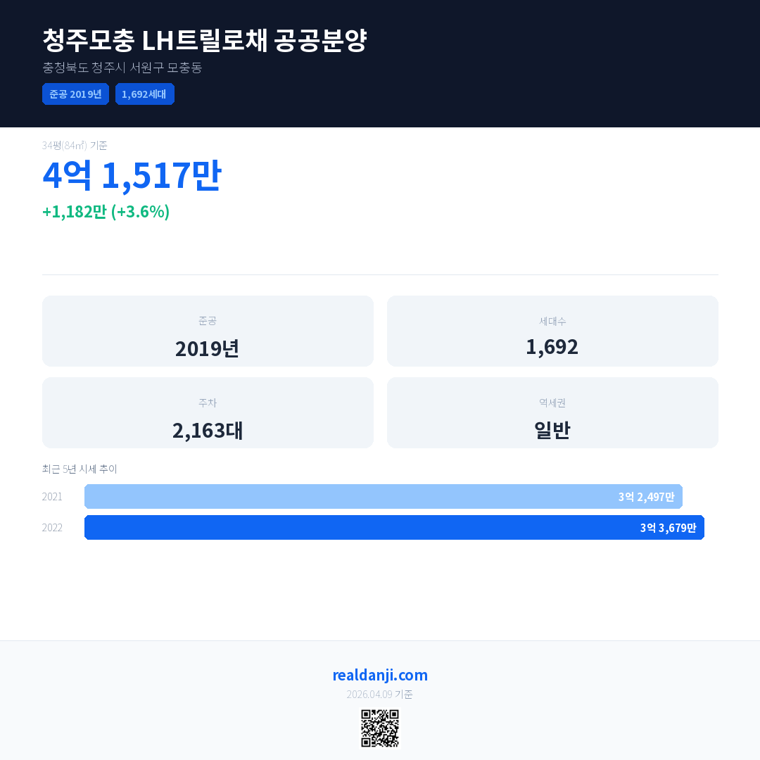 청주모충 LH트릴로채 공공분양 최근 거래가는 4억 1,517만입니다. (2022-06)
