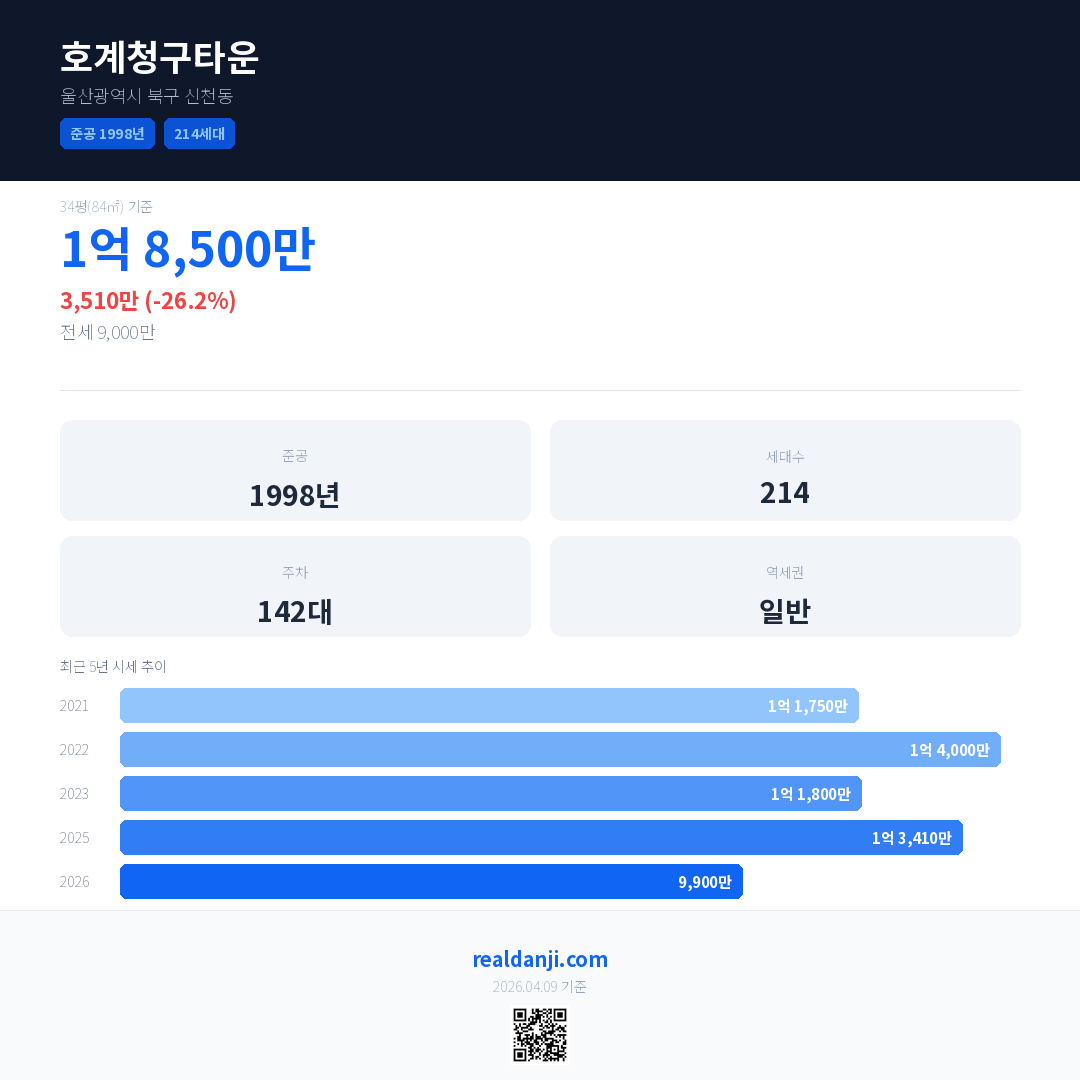 호계청구타운 국민평형 기준 2026년 평균 거래가는 9,900만으로, 전년 대비 26.2% 하락 했습니다.