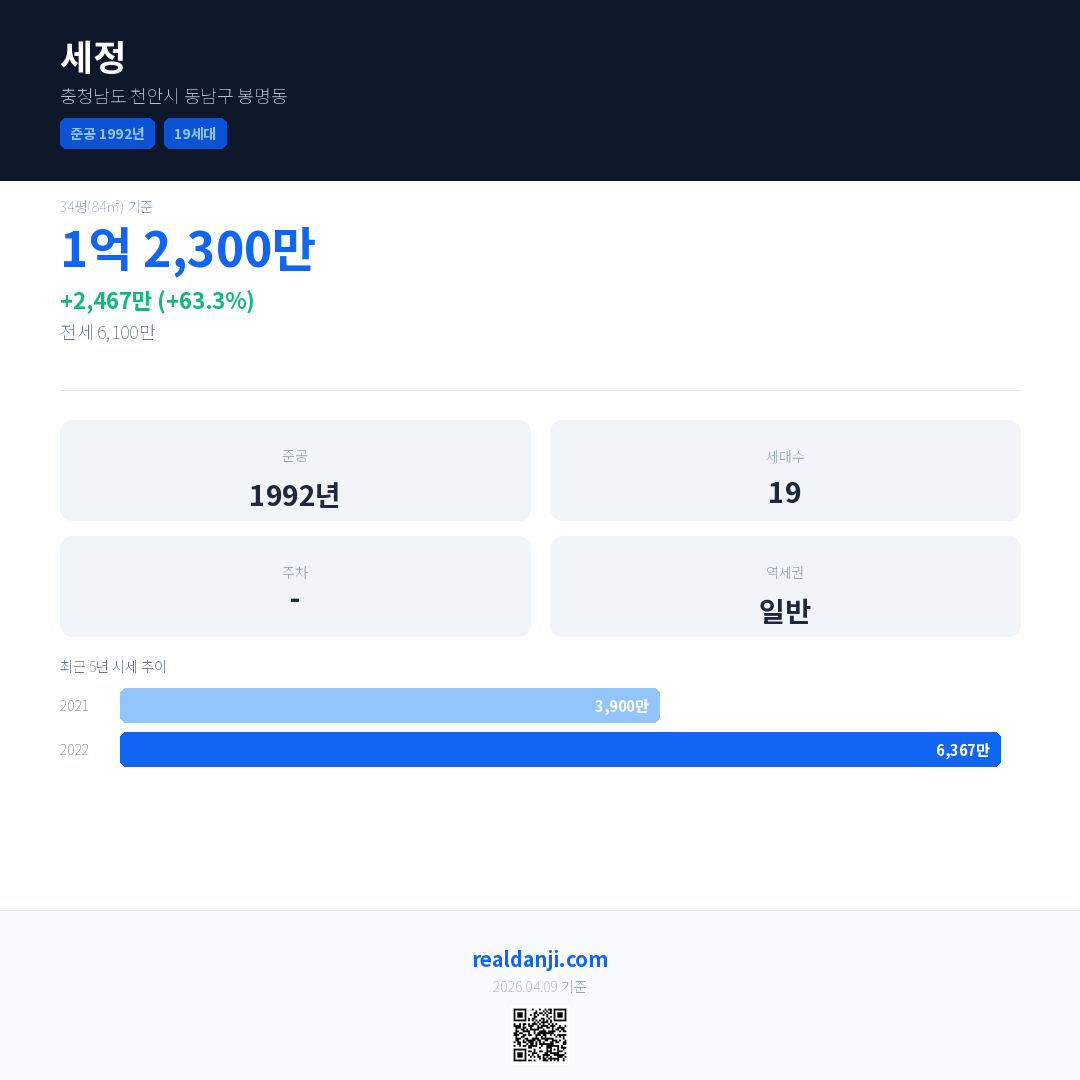 세정 국민평형 기준 2022년 평균 거래가는 6,367만으로, 전년 대비 63.3% 상승 했습니다.