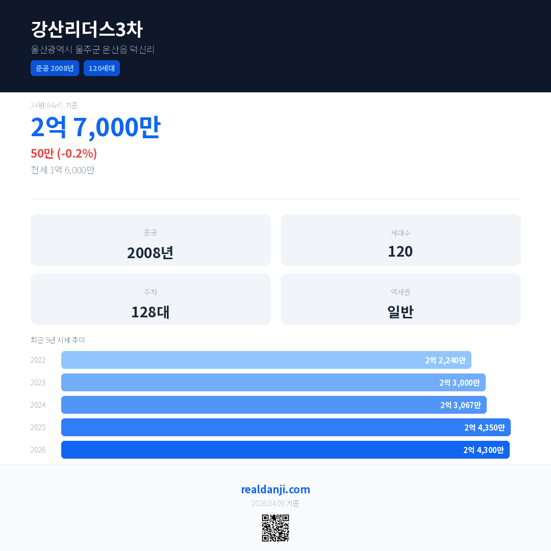 강산리더스3차 최근 거래가는 2억 7,000만입니다. (2026-03)