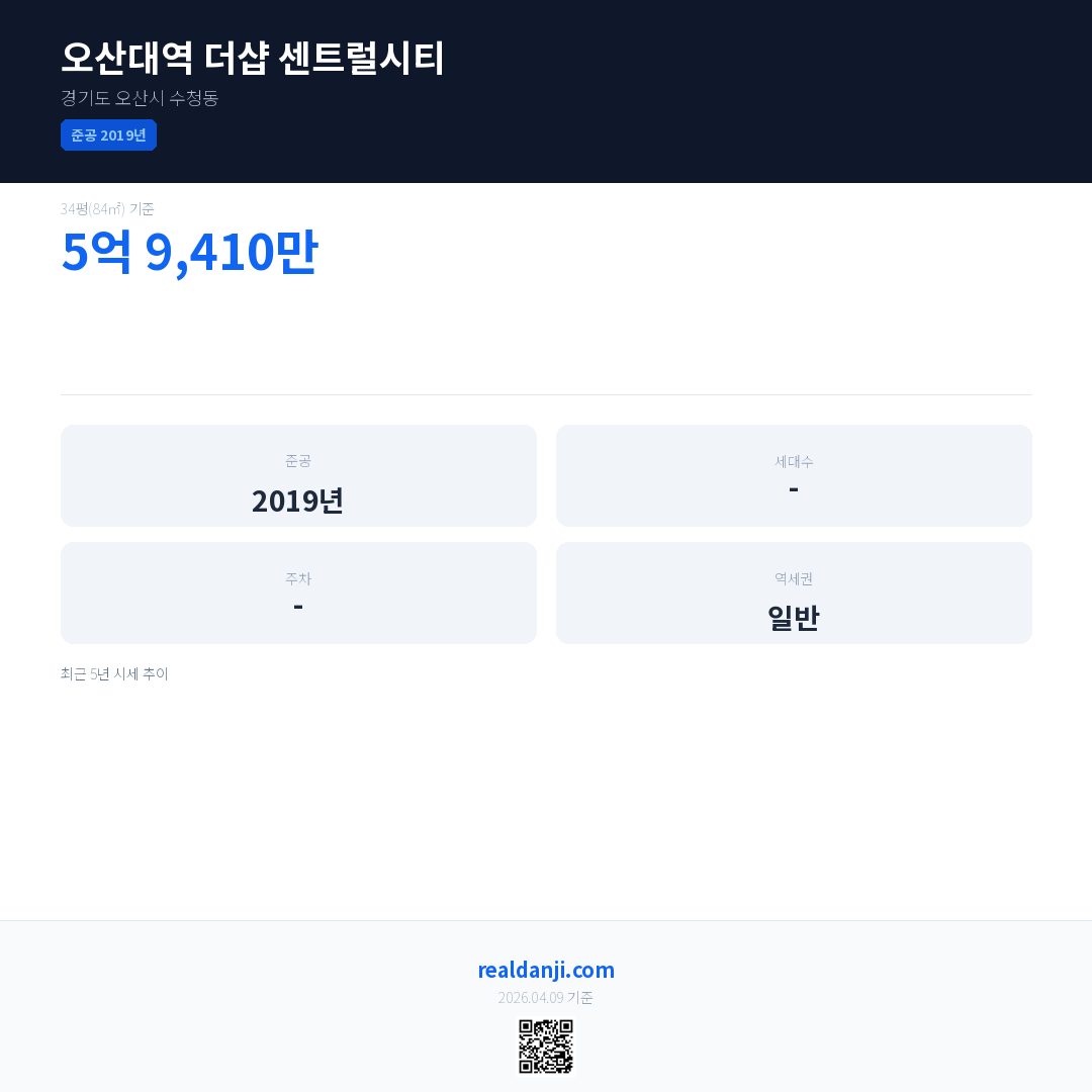 오산대역 더샵 센트럴시티 최근 거래가는 5억 9,410만입니다. (2020-08)
