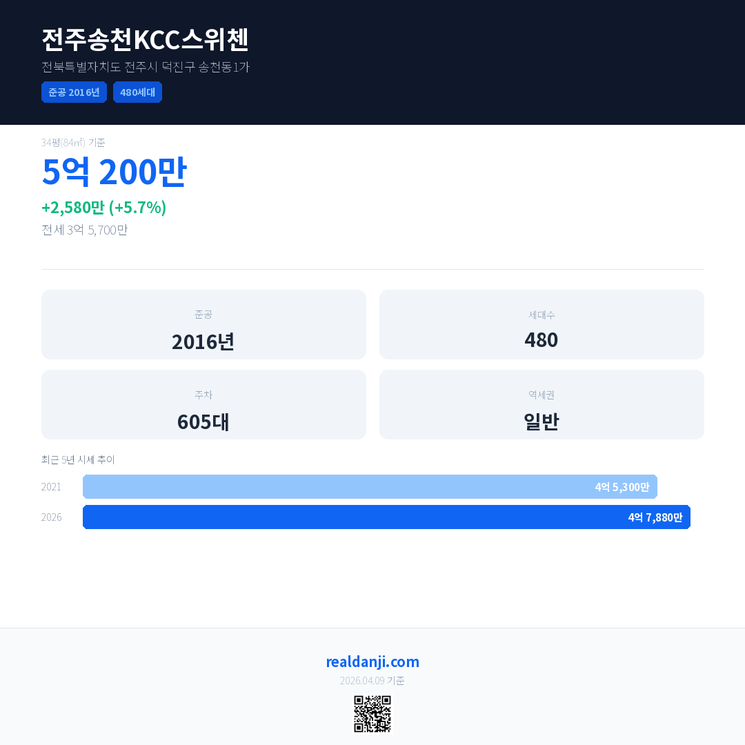 전주송천KCC스위첸 최근 거래가는 5억 200만입니다. (2026-04)