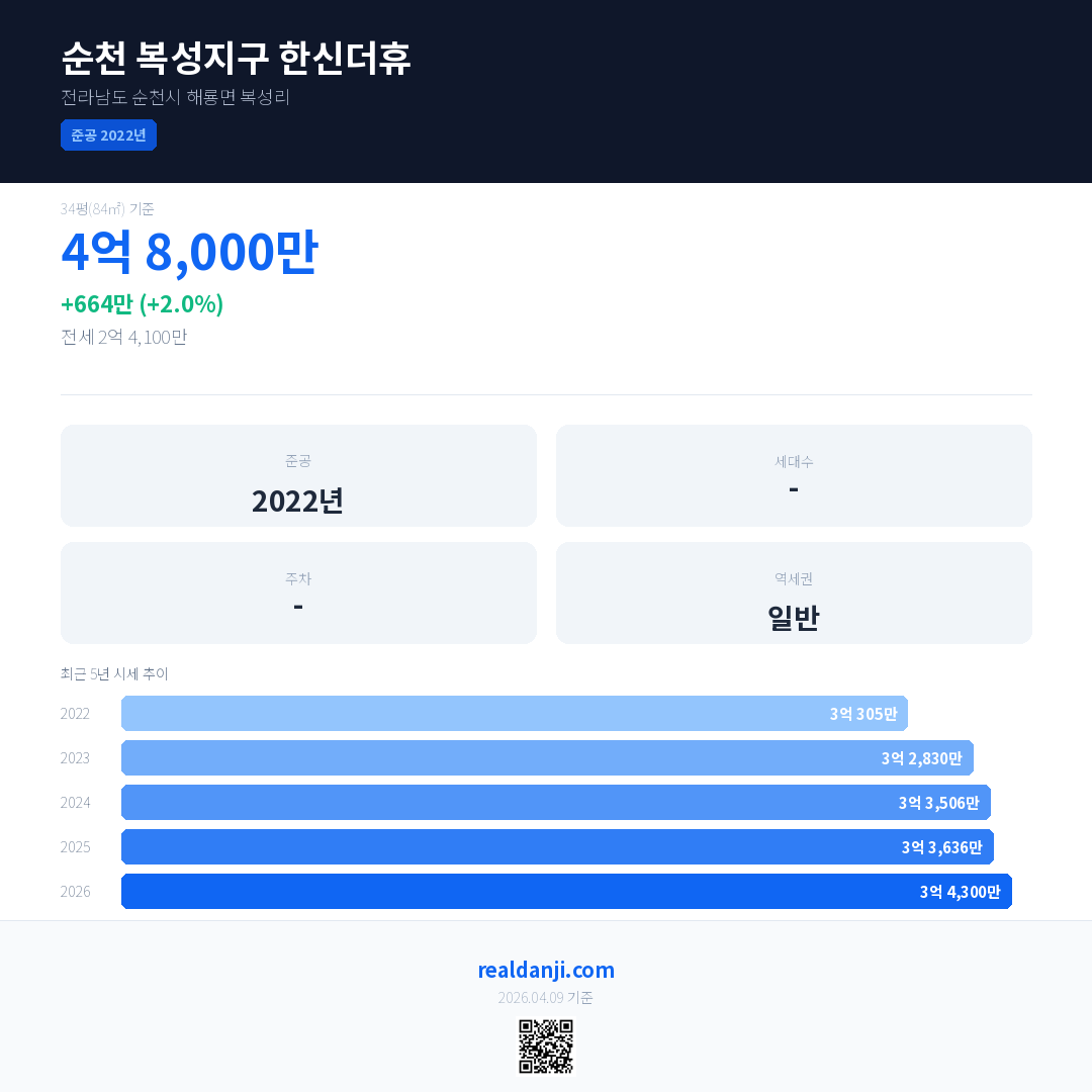 순천 복성지구 한신더휴 국민평형 기준 2026년 평균 거래가는 3억 4,300만으로, 전년 대비 2.0% 상승 했습니다.
