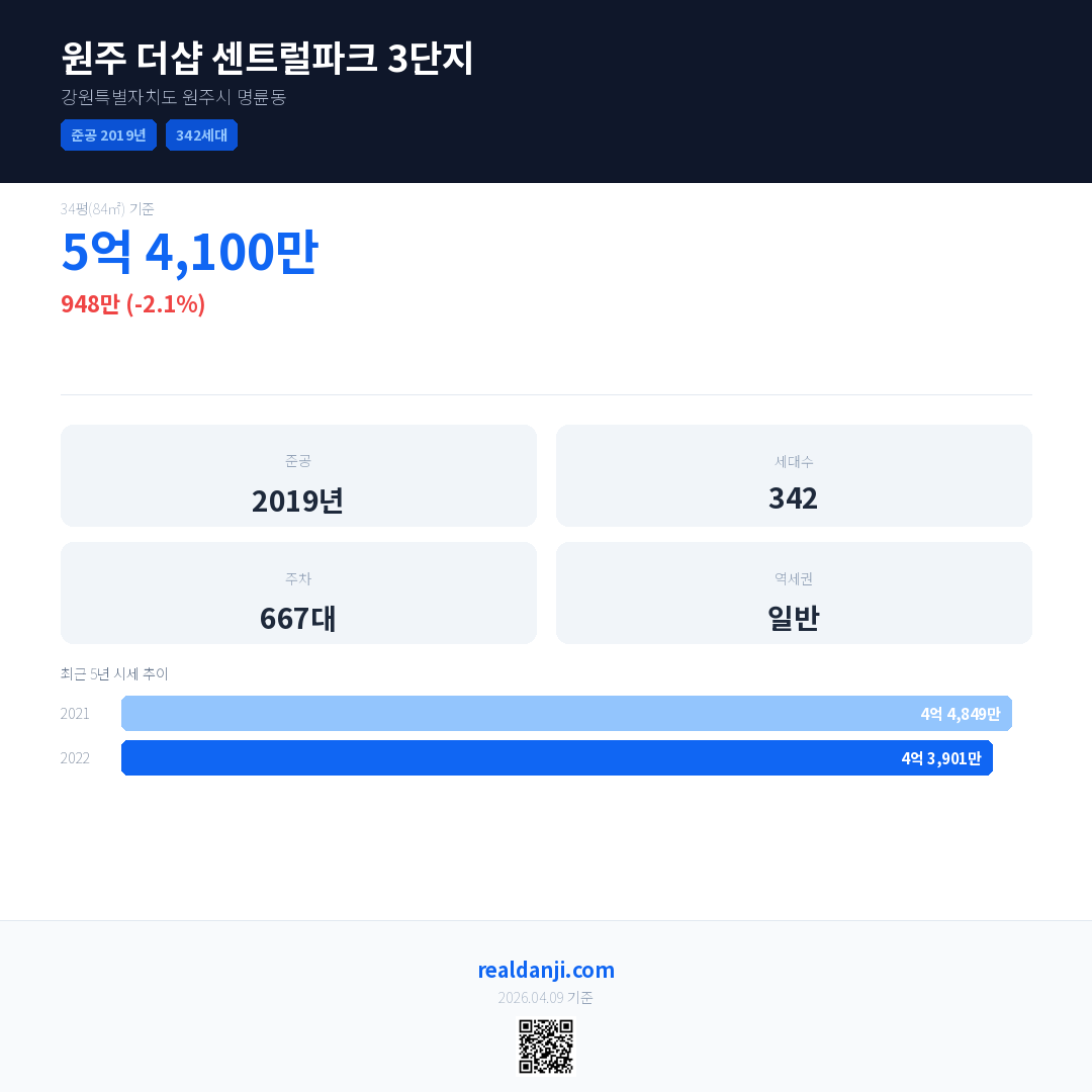원주 더샵 센트럴파크 3단지 최근 거래가는 5억 4,100만입니다. (2022-11)