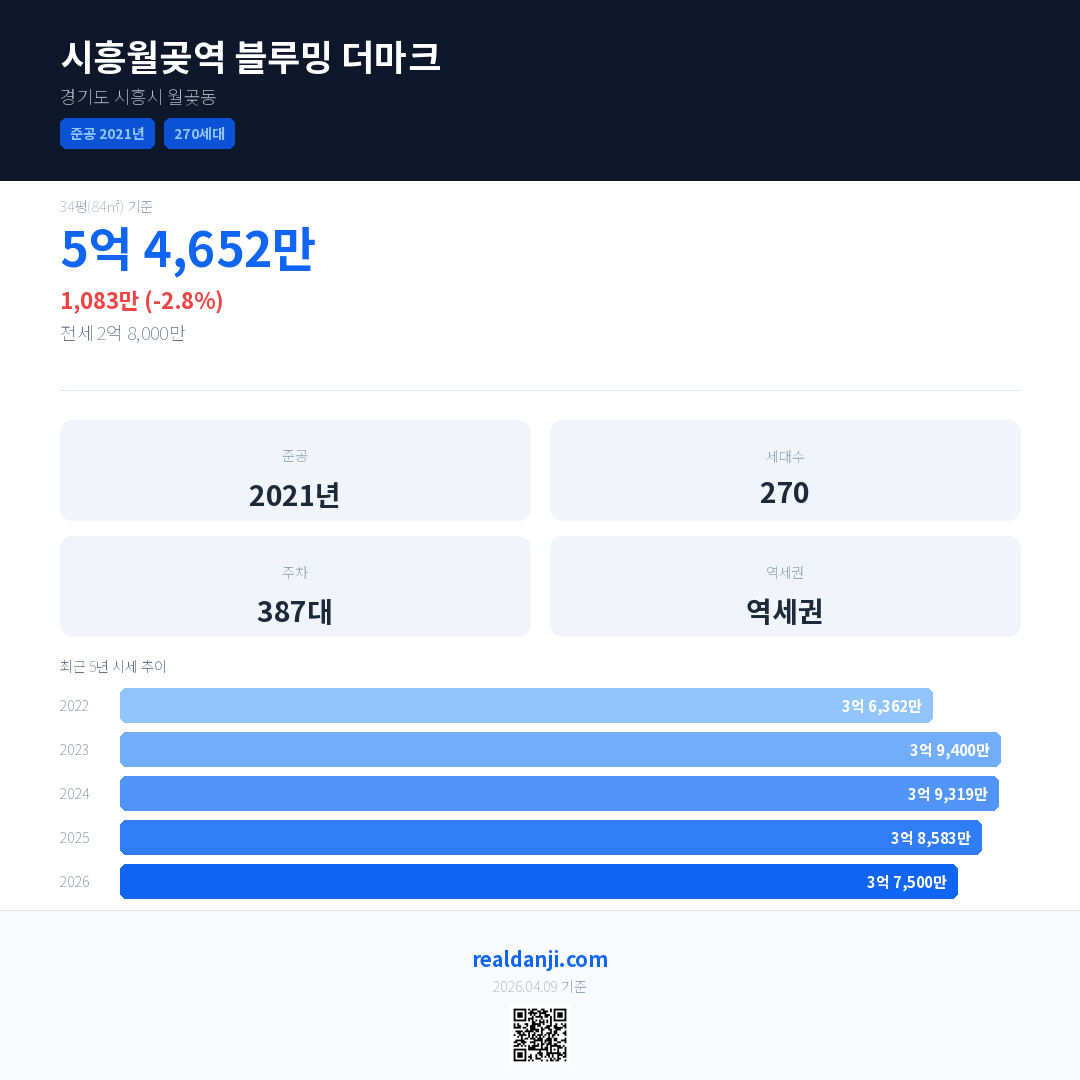 시흥월곶역 블루밍 더마크 최근 거래가는 5억 4,652만입니다. (2026-03)