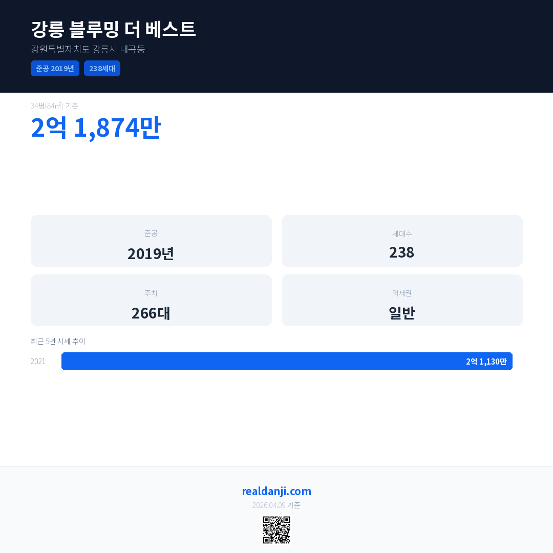 강릉 블루밍 더 베스트 최근 거래가는 2억 1,874만입니다. (2022-04)
