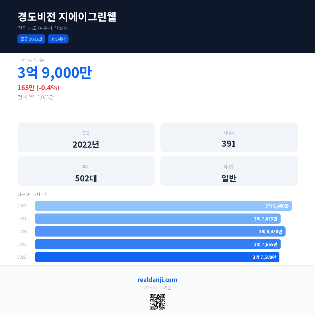 경도비전 지에이그린웰 국민평형 기준 2026년 평균 거래가는 3억 7,500만으로, 전년 대비 0.4% 하락 했습니다.