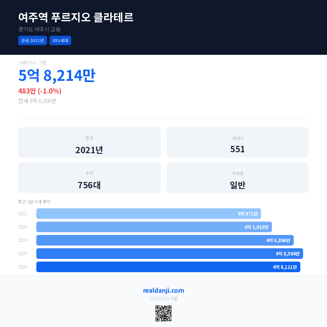 여주역 푸르지오 클라테르 최근 거래가는 4억 9,500만입니다. (2026-04)