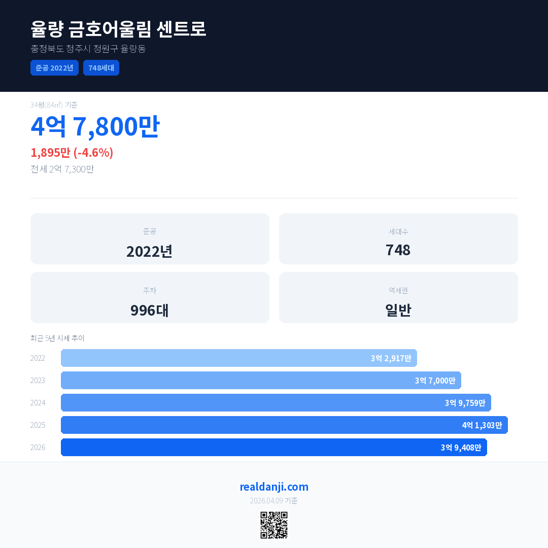 율량 금호어울림 센트로 국민평형 기준 2026년 평균 거래가는 3억 9,408만으로, 전년 대비 4.6% 하락 했습니다.