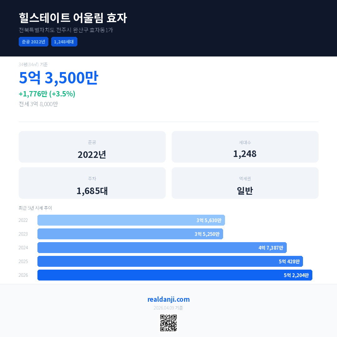 힐스테이트 어울림 효자 국민평형 기준 2026년 평균 거래가는 5억 2,204만으로, 전년 대비 3.5% 상승 했습니다.