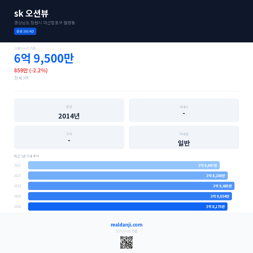 sk 오션뷰 국민평형 기준 2026년 평균 거래가는 3억 8,175만으로, 전년 대비 2.2% 하락 했습니다.