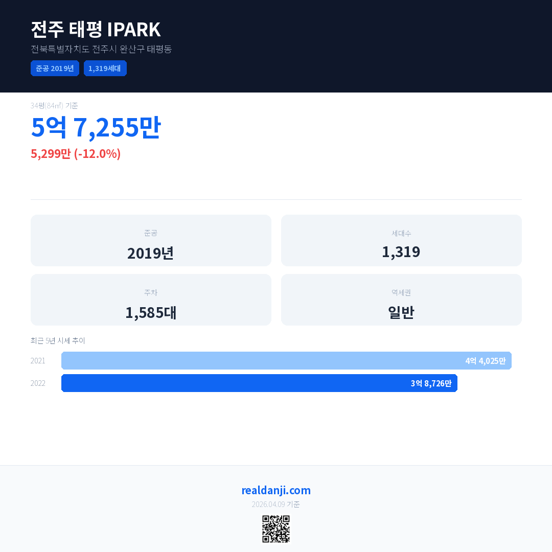전주 태평 IPARK 최근 거래가는 5억 7,255만입니다. (2022-08)