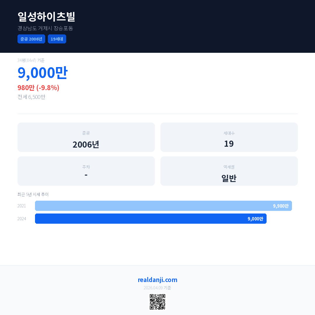 일성하이츠빌 국민평형 기준 2024년 평균 거래가는 9,000만으로, 전년 대비 9.8% 하락 했습니다.
