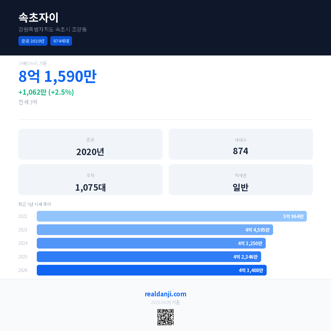 속초자이 국민평형 기준 2026년 평균 거래가는 4억 3,408만으로, 전년 대비 2.5% 상승 했습니다.