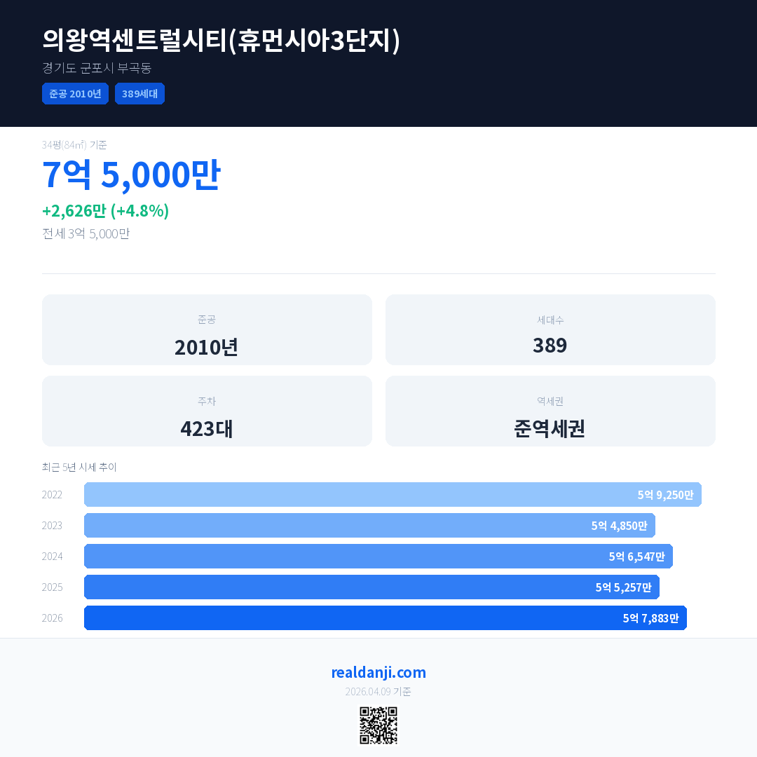 의왕역센트럴시티(휴먼시아3단지) 국민평형 기준 2026년 평균 거래가는 5억 7,883만으로, 전년 대비 4.8% 상승 했습니다.
